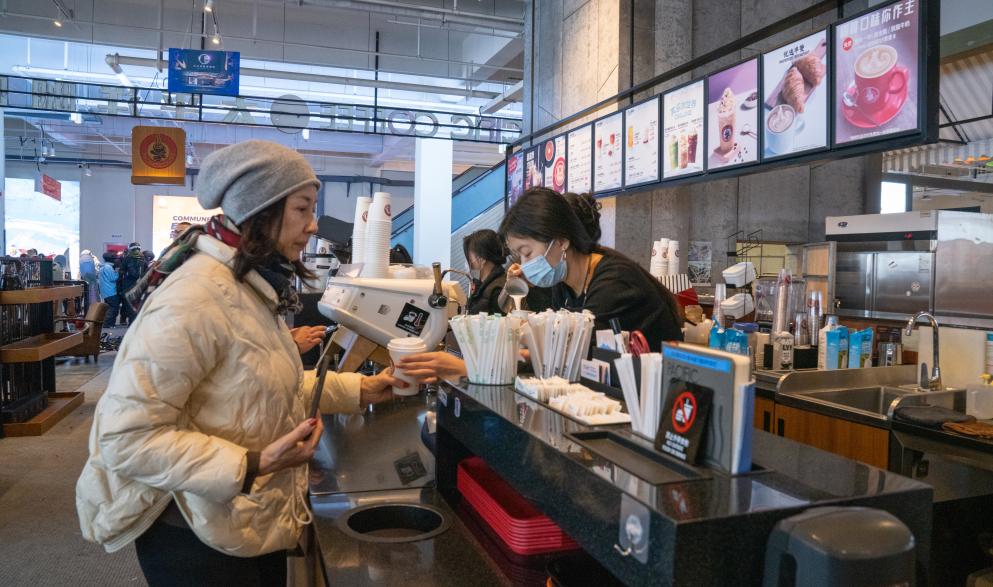 11月22日,游客在吉林市北大湖滑雪度假区购买咖啡。新华社记者 王帆 摄