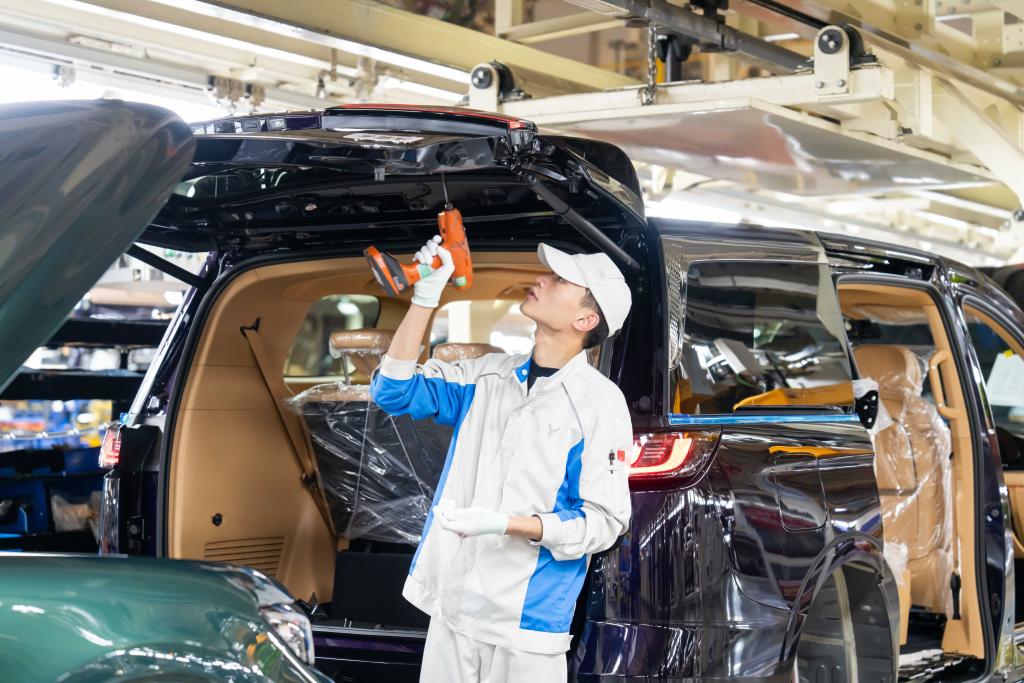 总装车间内,工人正在安装汽车后备箱。(侯毅超 摄)