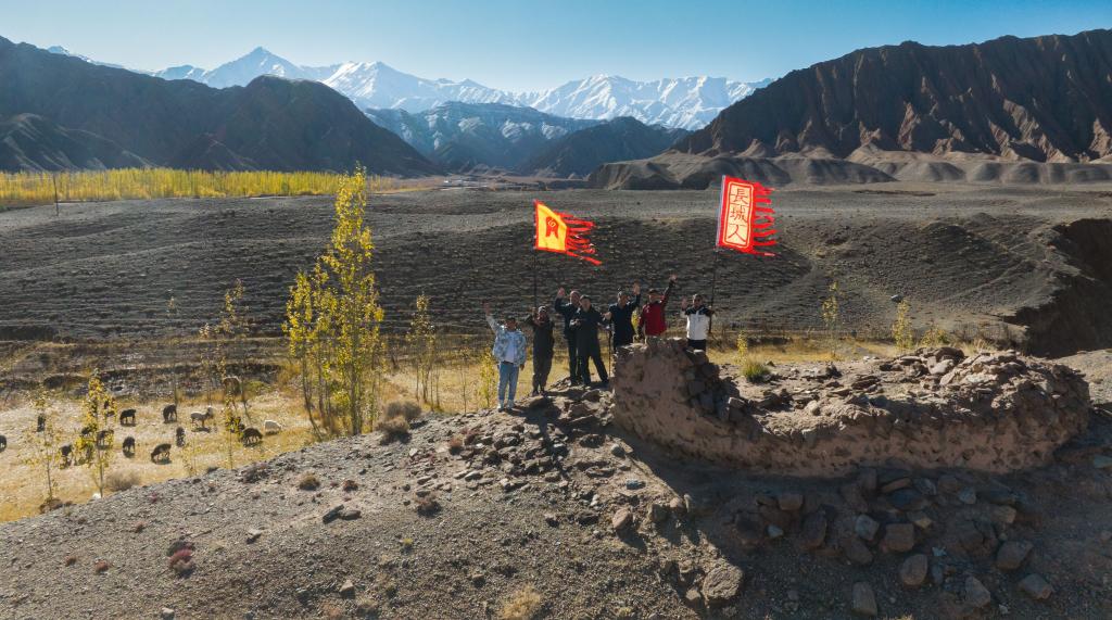 2023年10月18日,中国长城研究院院长赵琛(右四)带领科考队在新疆乌恰县考察山河关长城遗址。(受访者供图)