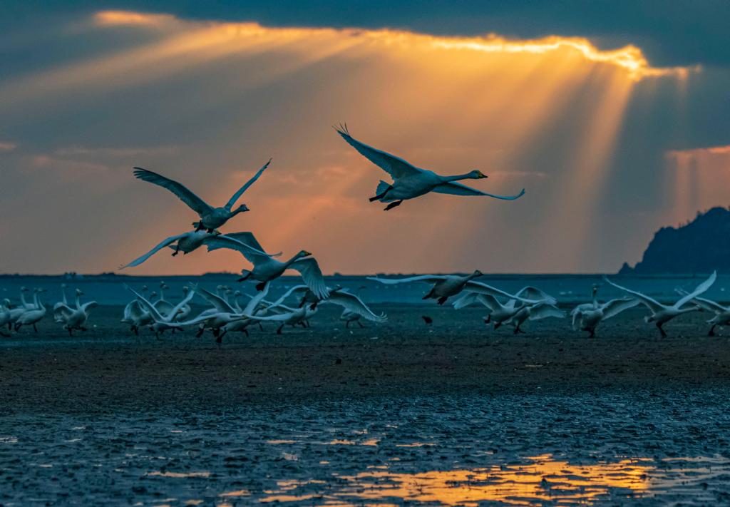 荣成天鹅湖畔,大天鹅飞舞。新华社发 李信君摄