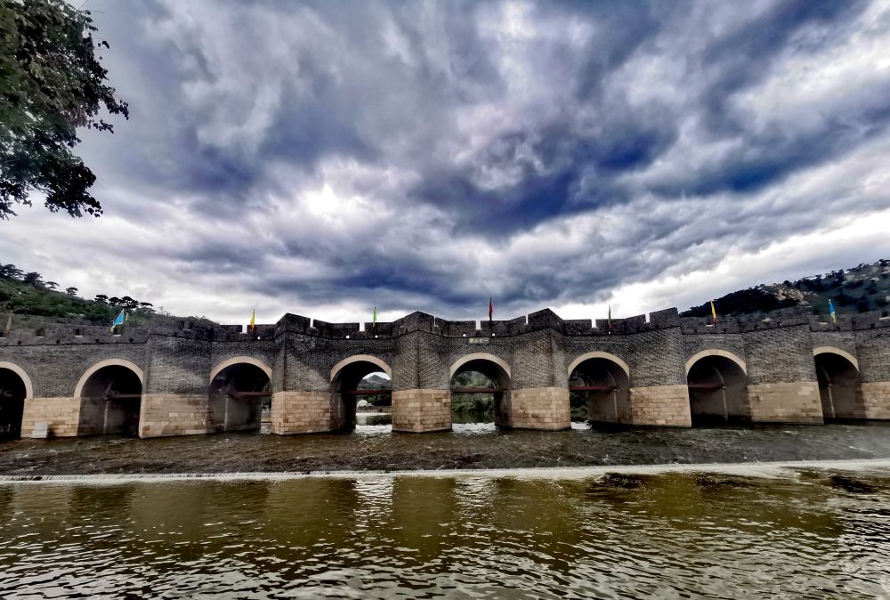 九门口长城的过河城桥独具特色,在百余米宽的河道上,用巨型条石砌起8个梭形桥墩,与两侧的围墙一起形成9个水门。梭形桥墩的设计能够形成交叉火力,增加了防御面积,又能起到一个水压分流的作用。