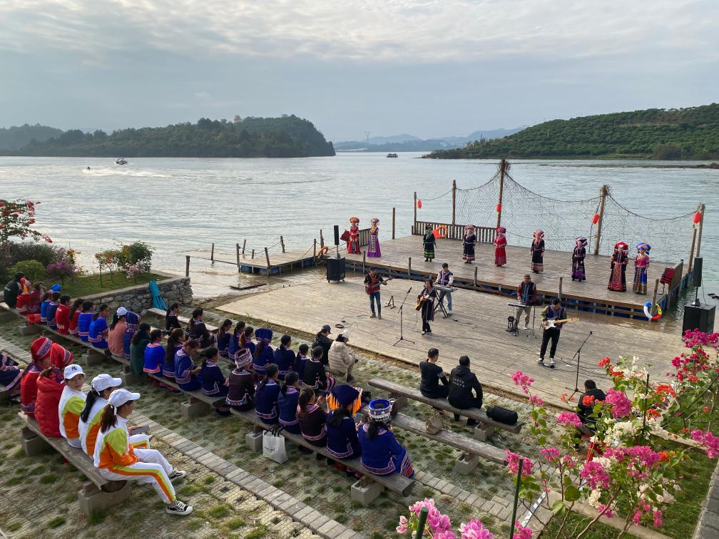 百色市右江区永乐镇西北乐村位于澄碧湖畔,村里非遗体验馆和农家书屋等木质建筑别具特色,文艺队队长岑美江正组织村民们在临湖舞台上进行歌舞表演,欢迎游客的到来。