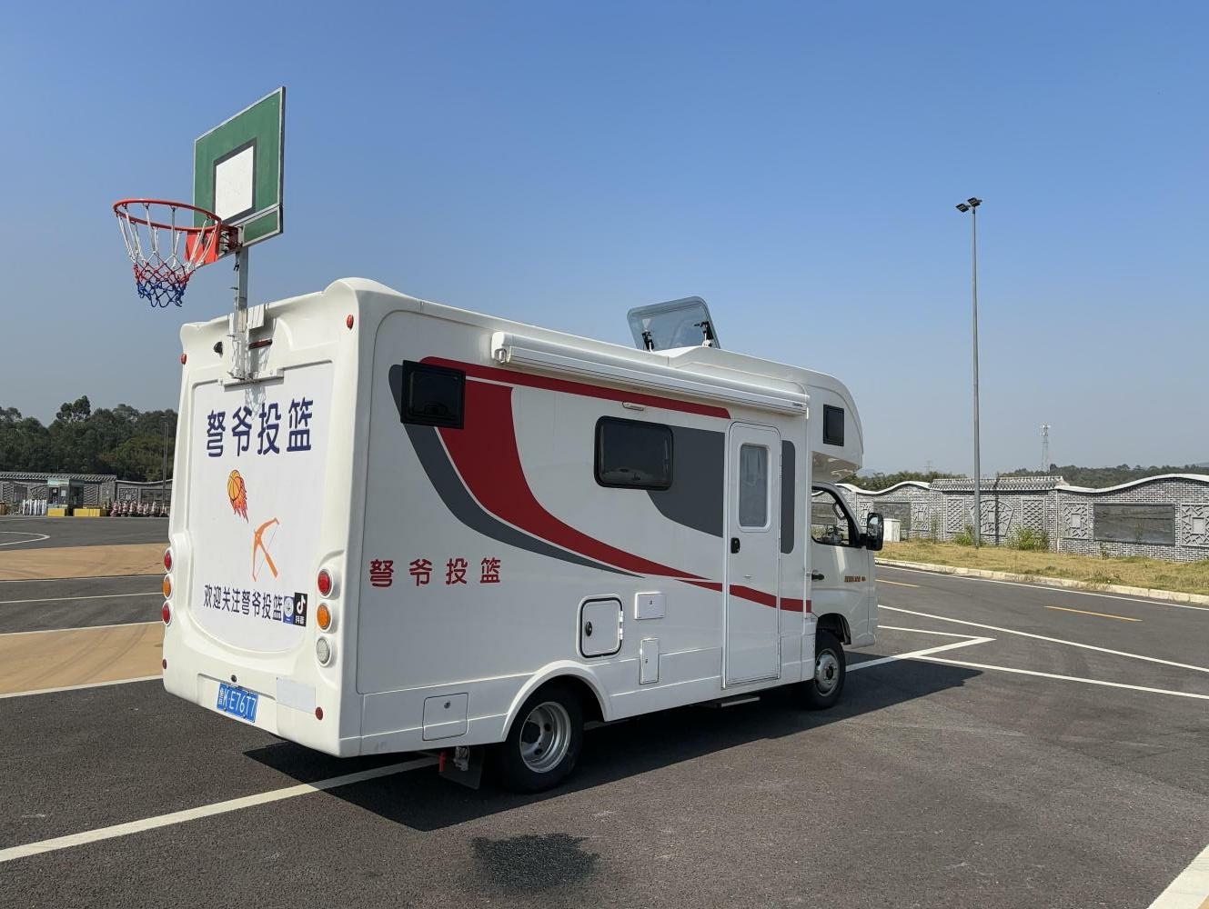王利智在房车上安装车载式、可拆卸折叠的篮球框