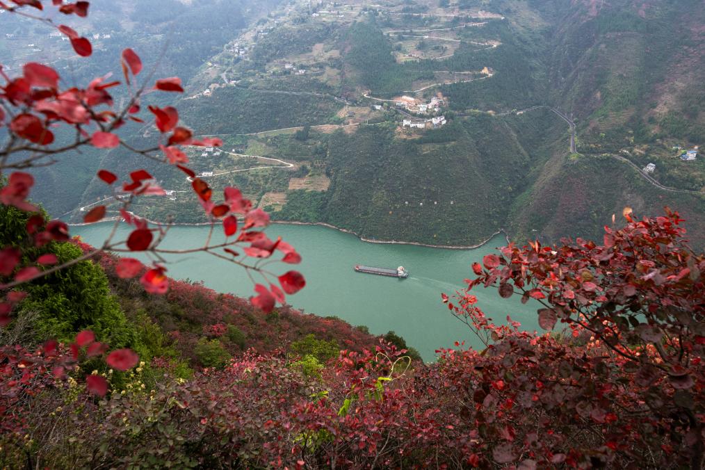11月30日,船舶行驶在红叶掩映下的长江三峡重庆市巫山县水域。新华社记者 肖艺九 摄