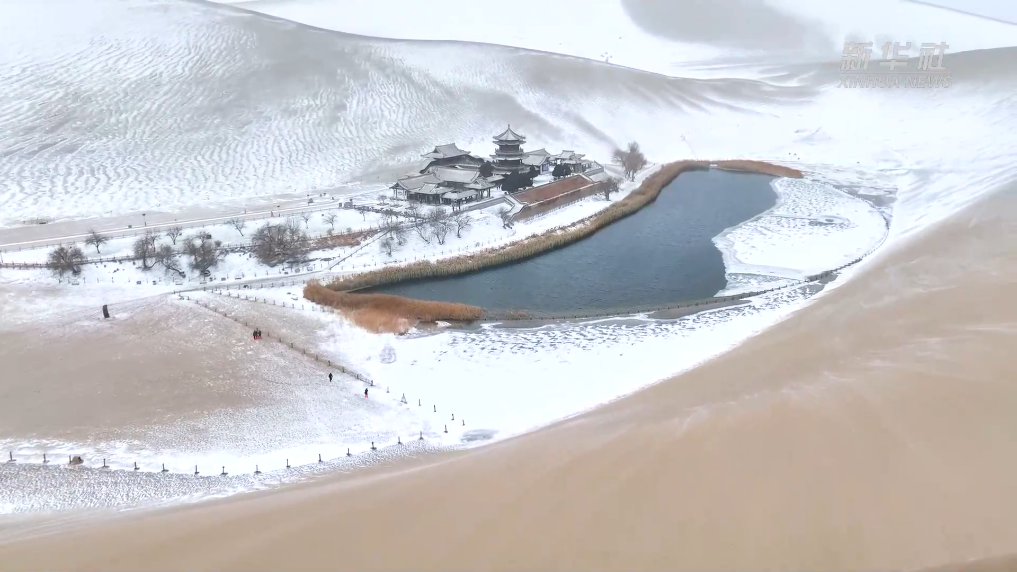 12月14日,位于甘肃省敦煌市的鸣沙山月牙泉景区迎来一场降雪。昔日沙泉共生、金沙碧波的鸣沙山与月牙泉“邂逅”皑皑白雪,连同岸边的芦苇荡和古建楼阁,构成一幅宁谧而优美的画卷。游客纷纷打卡拍照,收藏这份难得一见的“冰雪奇缘”。