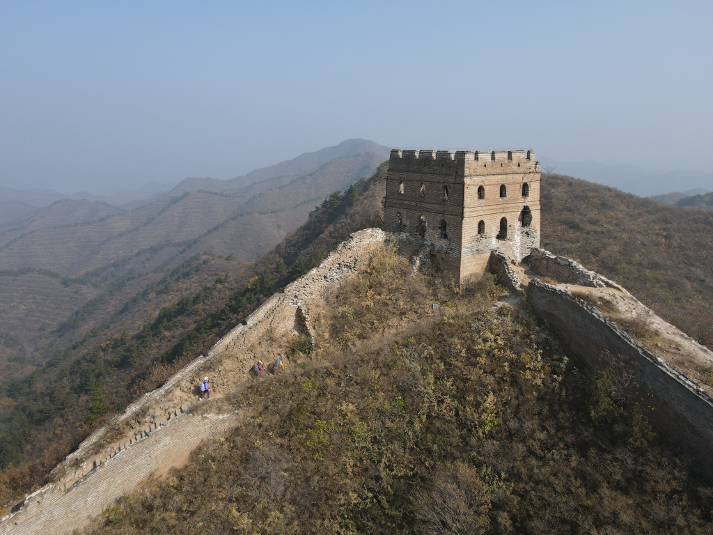 游客向古北口长城蟠龙山段的二十四眼楼攀登(无人机照片)。新华社记者夏子麟 摄