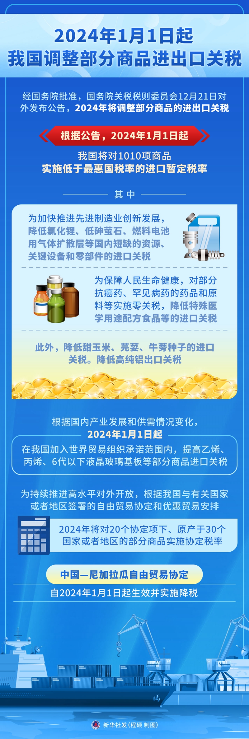 为持续推进高水平对外开放,根据我国与有关国家或者地区签署的自由贸易协定和优惠贸易安排,2024年将对20个协定项下、原产于30个国家或者地区的部分商品实施协定税率。中国—尼加拉瓜自由贸易协定自2024年1月1日起生效并实施降税。