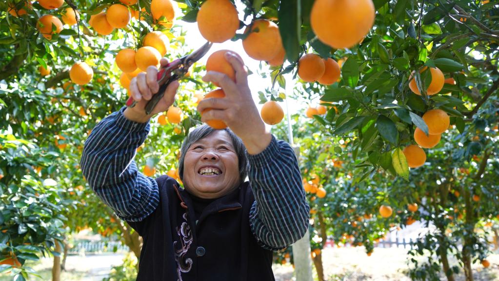 12月20日,大树垭村1组村民张中全在自家果园采摘柑橘。(黄未 摄)