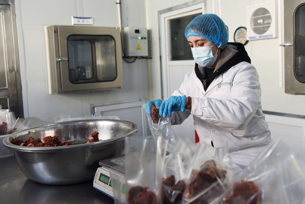 2023年9月24日,在塔县一处牦牛肉加工厂的生产车间,工作人员在将牦牛肉干装袋。新华社记者 高晗 摄