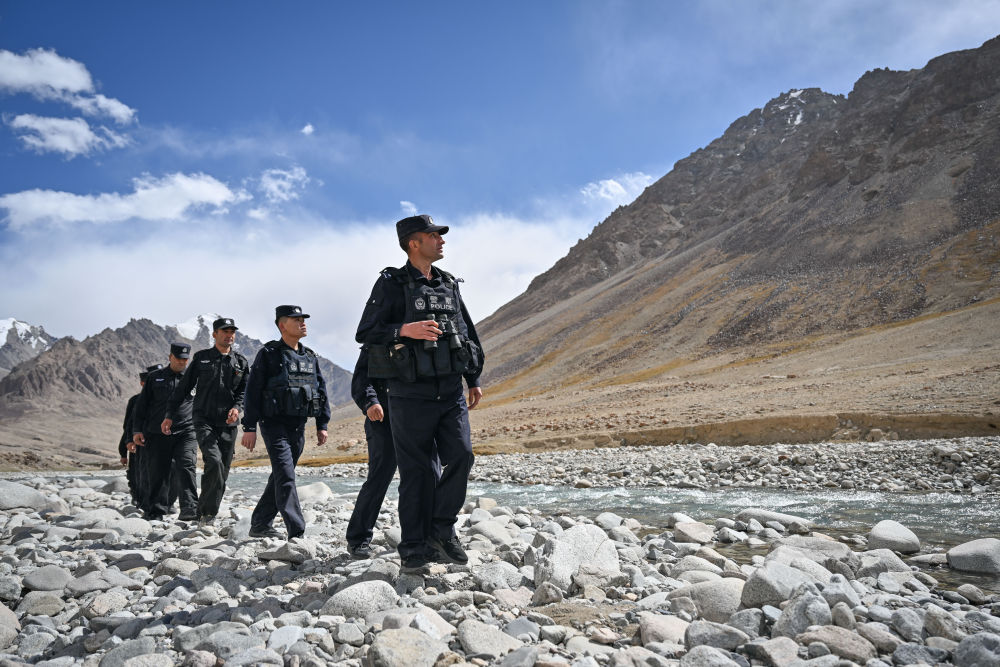 2023年9月21日,新疆喀什边境管理支队排依克边境派出所民警带领护边员,在瓦罕走廊巡逻踏查。新华社记者 李响 摄