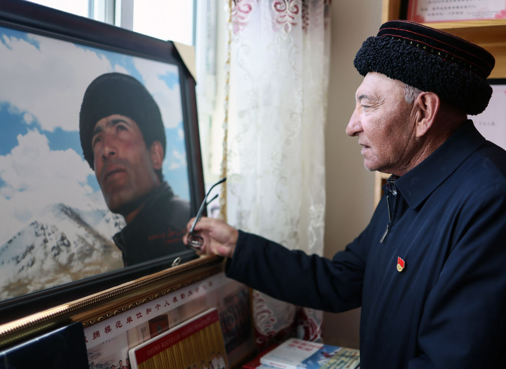 2023年9月4日,在塔县,“时代楷模”拉齐尼·巴依卡的父亲抚摸儿子生前的照片。新华社记者 兰红光 摄