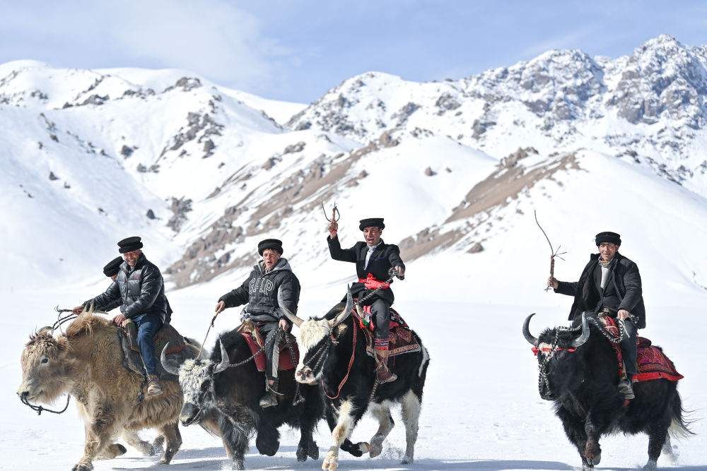 2023年3月19日,在塔县达布达尔乡,牦牛叼羊非物质文化遗产代表性传承人比江·比格瓦孜(右二)和队友骑着牦牛在村旁的一块空地上训练。新华社记者 李响 摄