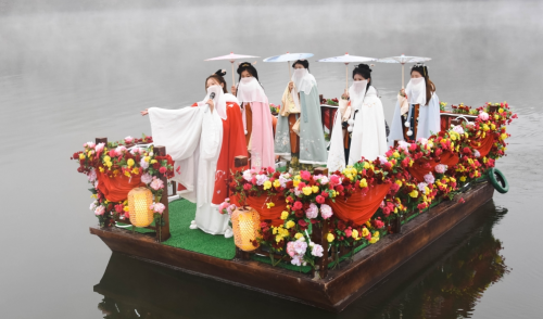 南召县五朵山景区九龙湖上花船泛舟欢歌。