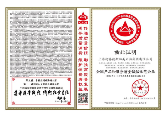 日前,世界范围内的“3.15”国际消费者权益保护日宣传活动正在许多国家和地区举行。在中国,今年被定为全国消协组织消费维权年,活动主题是“激发消费活力”。在这个举国上下为消费者发力与维权的日子里,中国质量检验协会再次授予上海柯赛德斯加美石油集团有限公司“全国产品和服务质量诚信示范企业”证书,涵盖了该集团旗下管理的“中讯润滑油”、“柯赛德润滑油”、“柯赛德斯-加美润滑油”三大品牌的九大系列产品,而且是该集团实施品牌多元化战略以来连续第4年获得此项称号。