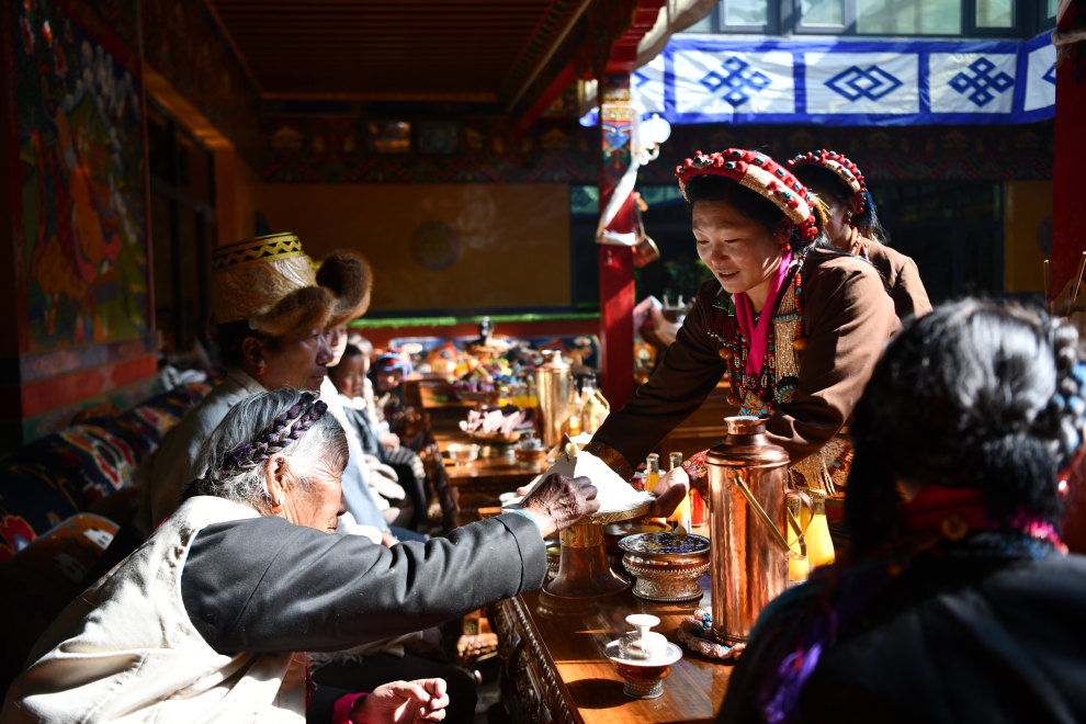次旦老人接过孙女敬献的切玛(2023年1月22日摄)。