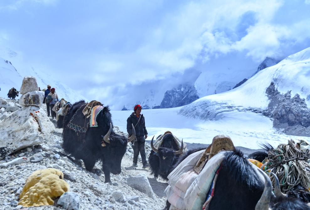 珠峰山区特殊的自然环境,致使牦牛驮运成为珠峰登山、科考和探险等活动中运输物资最主要的方式。应运而生的牦牛运输队和牦牛工也成为扎西宗乡壮年劳力在登山季里的固定“职业”。无论是在1960年中国登山队首登珠峰这样的大型任务里,还是后续兴起的北坡商业登山活动,亦或是历次珠峰大型科考活动中,都有扎西宗乡农牧民赶着牦牛驮运物资上山的身影。