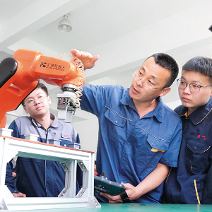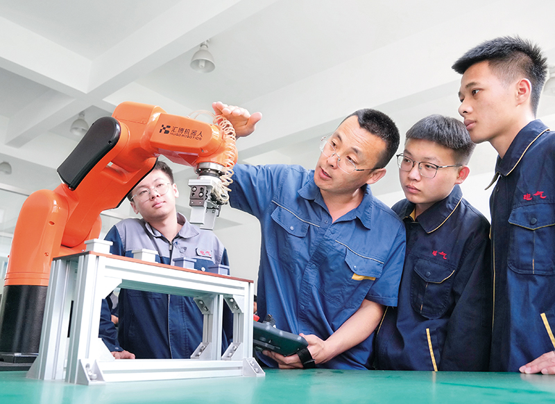 河北省秦皇岛工业职业技术学院的老师(右三)给电气工程专业学生讲解机器人的工作原理(2023年6月13日摄) 杨世尧摄/本刊