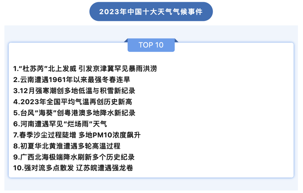 近年来,“XX年一遇”的高温、暴雨、寒潮似乎频繁了不少,“极端天气”这个曾经略显生僻的气象专业名词也逐渐被公众熟知。国家气候中心1月19日发布2023年国内十大天气气候事件,台风“杜苏芮”北上引发京津冀罕见暴雨洪涝、春季沙尘过程陡增、辽苏皖遭遇强龙卷等让大家印象深刻的极端天气均在列。