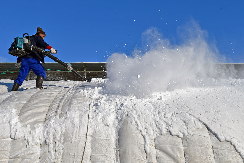 2023年12月17日,农民在山东省烟台市福山区门楼街道用鼓风机清理暖棚上的积雪。新华社发(孙文潭摄)