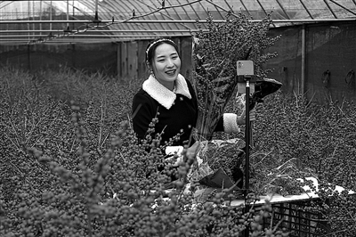 临近春节,云南省昆明市晋宁区各花卉种植基地种植的蝴蝶兰、北美冬青、腊梅等年宵花卉迎来销售旺季。图为一名工作人员在昆明市晋宁区一家北美冬青种植基地的大棚里直播销售。新华社记者 崔文 摄