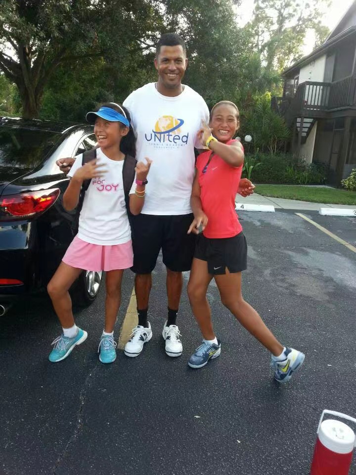 2013年,郑钦文(右)在美国网球学校训练时