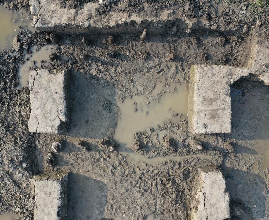 在亭山遗址南区,考古工作者则发现了建于人工台地上的大型建筑基址。目前已经揭露了一片东西长56米、南北宽10.5米的区域。从建筑基址遗迹上看,古人先挖基槽埋下地梁,再在地梁上立柱,并在基槽两端开挖柱坑。地梁立柱的柱网结构为面阔30间、进深7间。柱坑里的方形木柱础边长50厘米至80厘米不等,上面还有漆绘,相当豪华考究。徐新民说,从已经揭露的区域看,该建筑当属高等级的礼制性公共建筑。