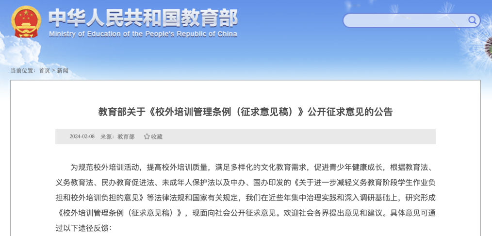 教育部2月8日就《校外培训管理条例(征求意见稿)》面向社会公开征求意见。征求意见稿提出,校外培训应当安排在培训所在地中小学教学时间之外的时间,不得占用国家法定节假日、休息日及寒暑假期组织义务教育阶段学科类培训。