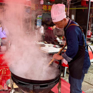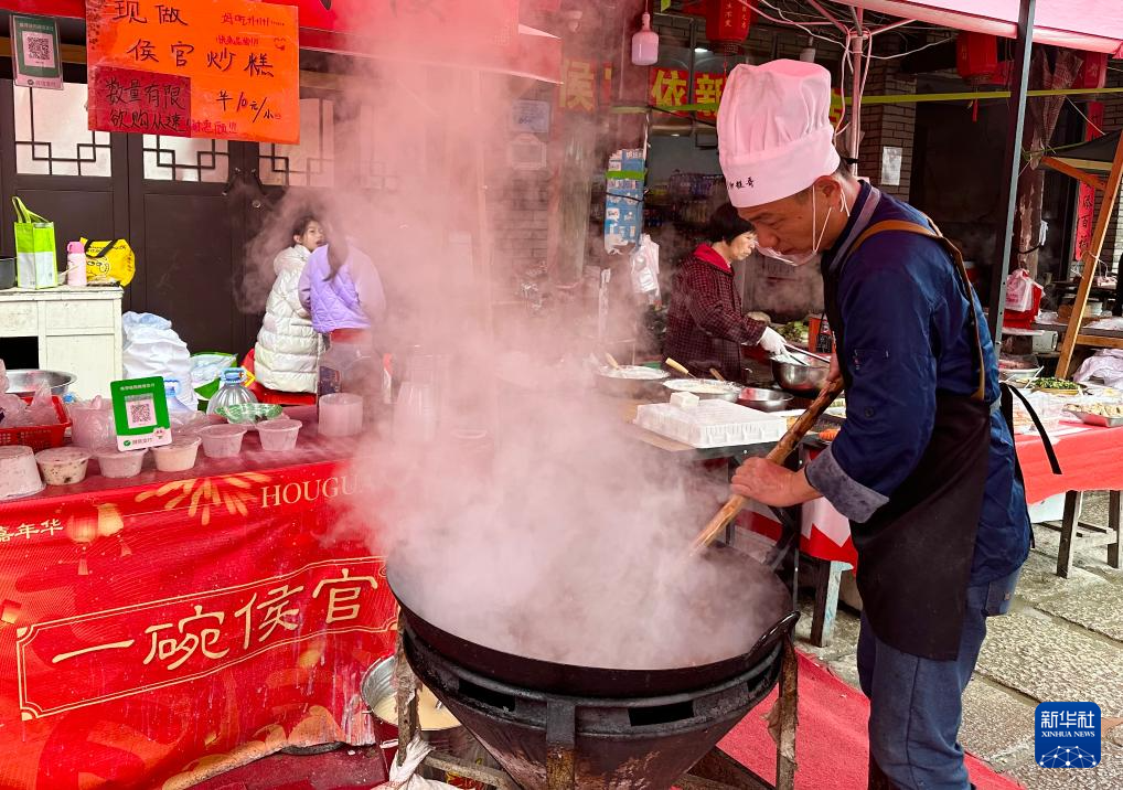 “市集人来人往,最多的时候一天要炒十大锅,手工制作的年节小吃比较有‘古早味’,最近挺受欢迎的。”吴佳贤说。他从小在村子里长大,曾外出当过厨师,借着古街复苏的“东风”,便回村开了个摊位,全家人一起忙活得不亦乐乎。