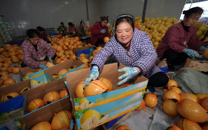 产自贵州岑巩县的思州柚准备发往俄罗斯(2023年11月28日摄)。新华社发(唐鹏摄)
