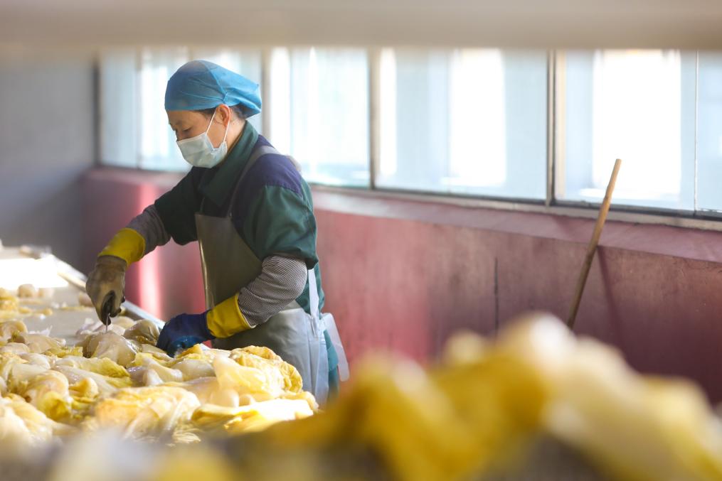 黑龙江翠花集团新民农产品有限公司的生产线上,员工正加工酸菜。新华社记者陈为 摄