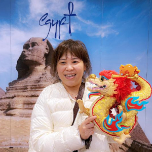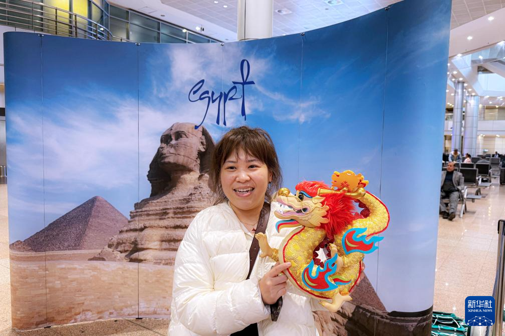 2月10日,一名中国游客在埃及开罗国际机场举行的“欢迎中国游客来埃及过大年”仪式上拍照留念。新华社发(艾哈迈德·戈马摄)