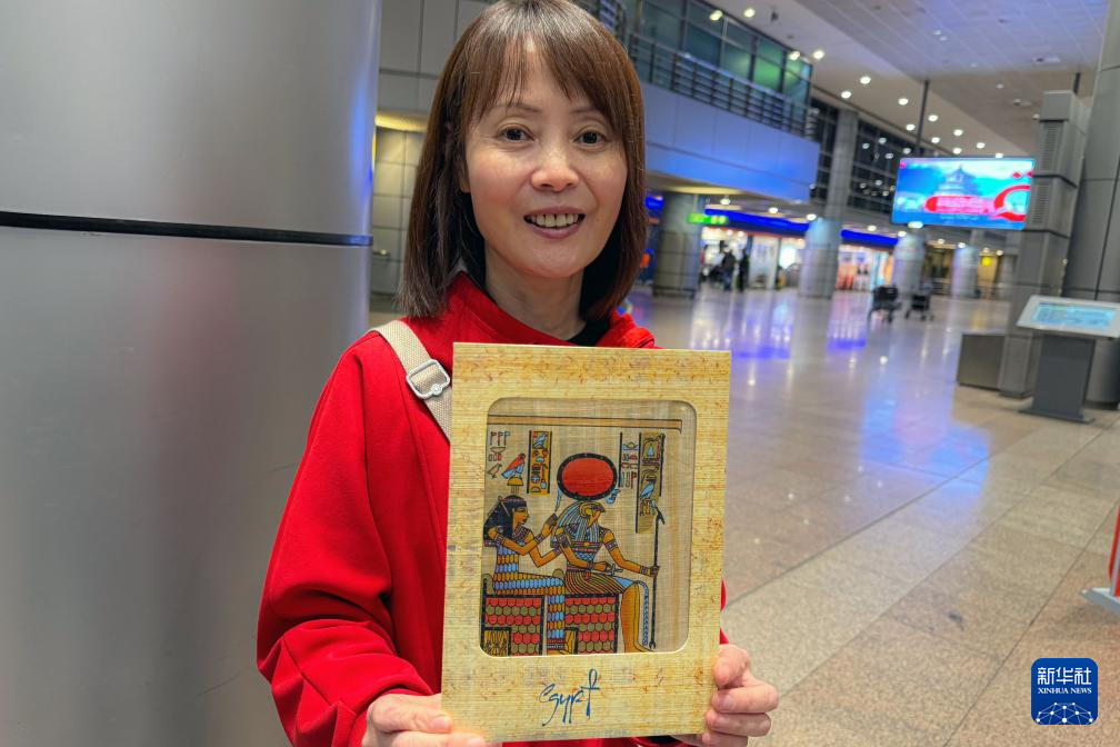 2月10日,在埃及开罗国际机场举行的“欢迎中国游客来埃及过大年”仪式上,一名中国游客展示埃及旅游促进局赠送的新年礼物。新华社发(艾哈迈德·戈马摄)