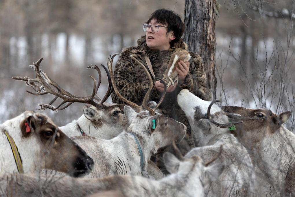 2023年1月13日,敖鲁古雅鄂温克人正在喂驯鹿。新华社记者 费茂华 摄