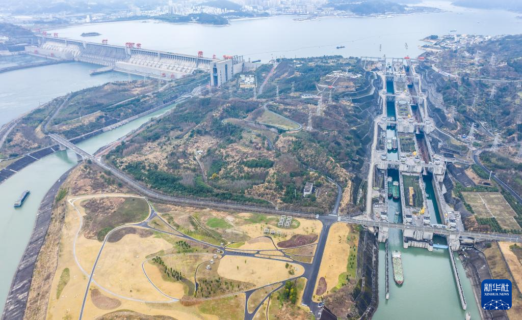 2月21日,三峡北线船闸进行检修施工(无人机照片)。新华社发(郑家裕摄)