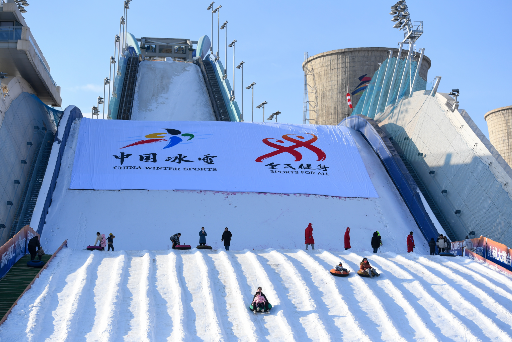 游客在首钢滑雪大跳台体验“雪圈冲浪”。新华社记者鞠焕宗 摄