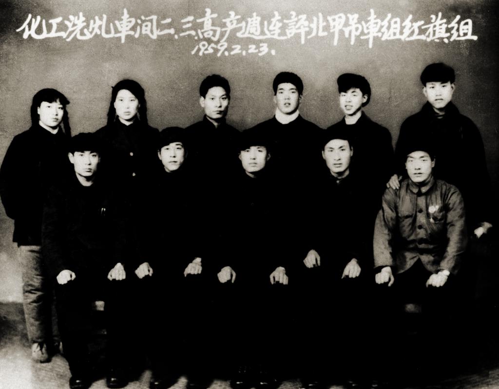 ↑1959年2月,雷锋所在鞍钢洗煤车间吊车组被评为红旗组,这是雷锋(后排右二)和工友合影。