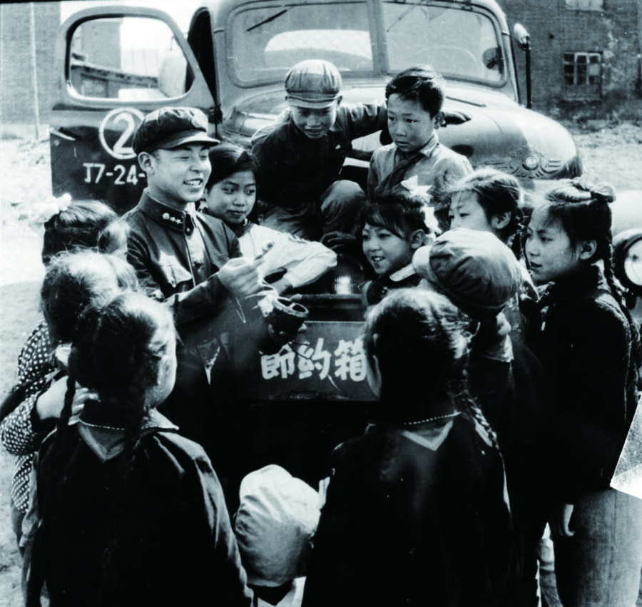 ↑雷锋被聘为某小学的校外辅导员,他教育孩子们不要忘记艰苦奋斗的光荣传统。