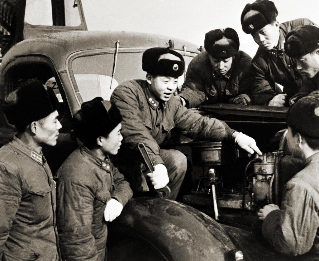 ↑雷锋(左三)在向战友们介绍节油经验。