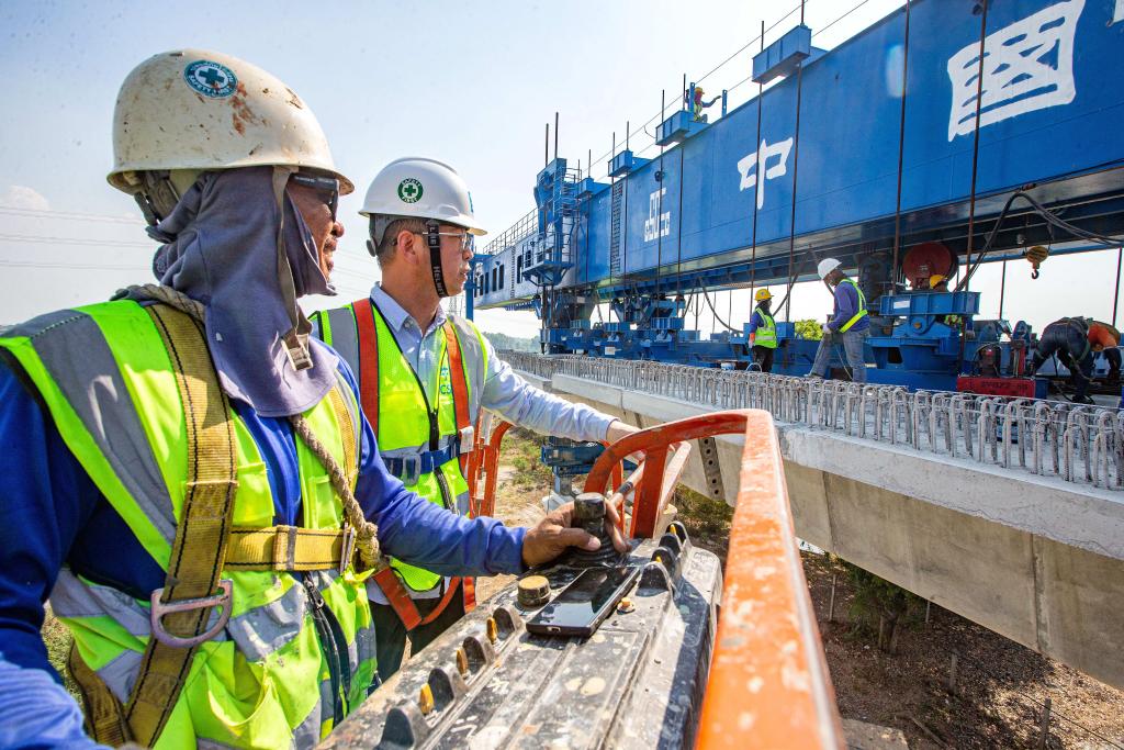 2月7日,在泰国大城府,中泰高铁项目工作人员在施工现场勘查。新华社记者 王腾 摄
