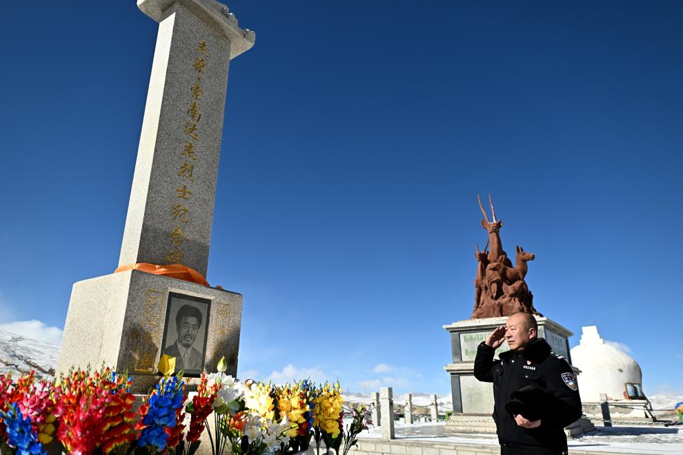 可可西里森林公安局巡山队员赵新录在昆仑山口索南达杰纪念碑前敬礼。新华社记者 张宏祥 摄