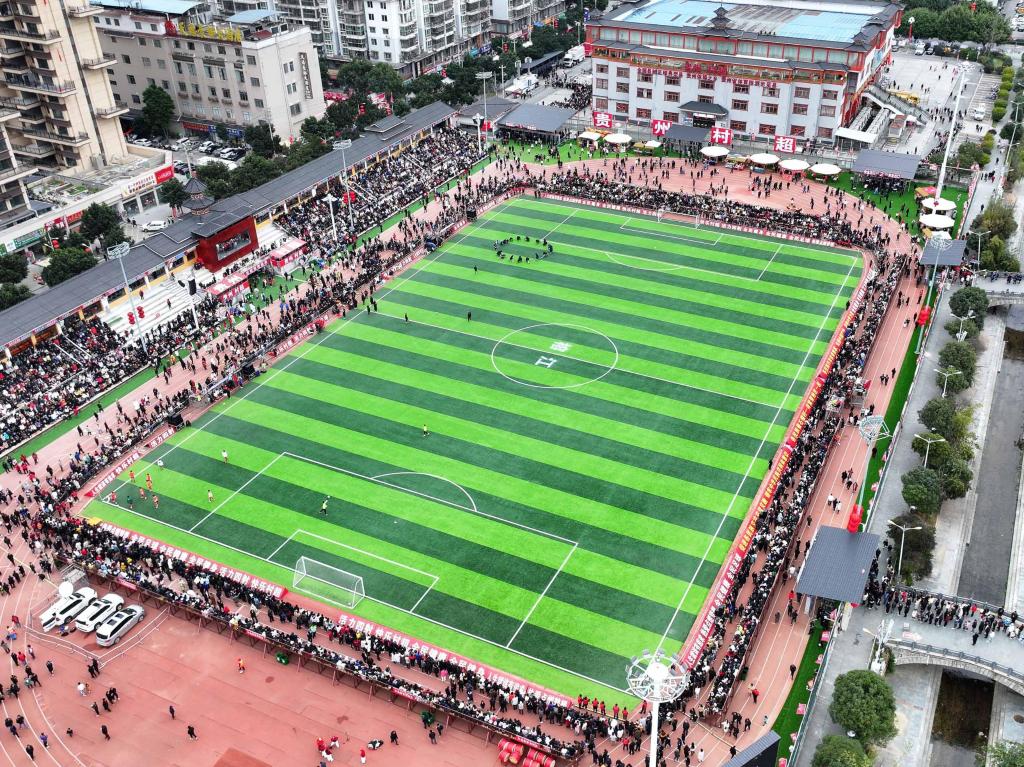 2月3日,观众在“村超”赛场等待活动开始(无人机照片)。新华社记者 刘续 摄