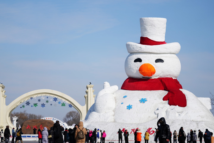 2月24日,在哈尔滨太阳岛雪博会园区门口,游客在大雪人前留影。新华社记者 王建威 摄