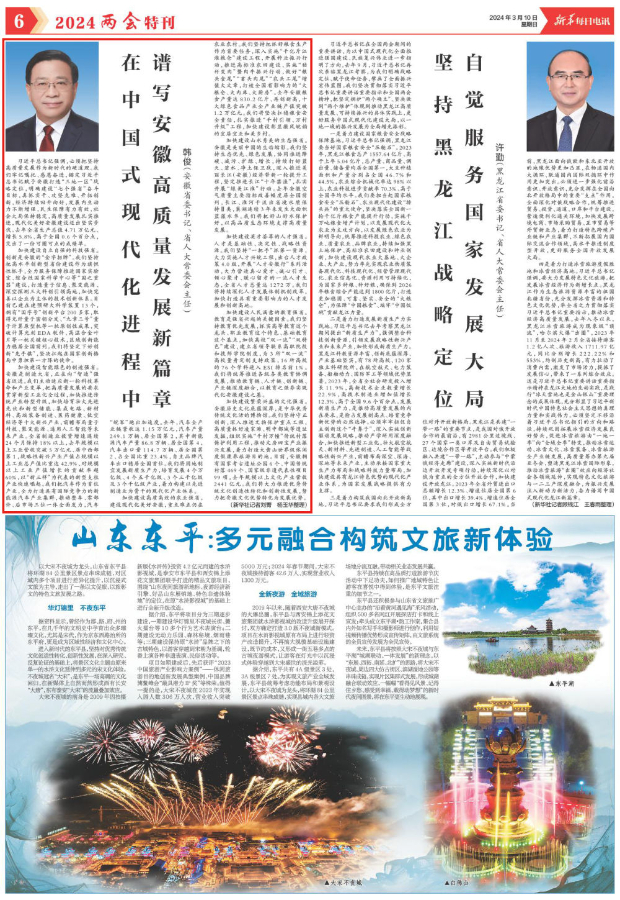 加快建设繁荣兴盛的文化强省。安徽历史文化底蕴深厚,是中华优秀传统文化活的博物馆。我们坚持守正创新,深入推进文物保护重点工程,高质量抓好凌家滩、明中都城等遗址发掘,组织实施“千村万幢”传统村落保护利用工程,推动文房四宝产业振兴发展,着力打造大黄山世界级休闲度假康养旅游目的地。目前,安徽拥有国家考古遗址公园6个、中国传统村落469个、国家级非遗代表性项目99项,去年规模以上文化产业营收2441亿元。我们将大力推进优秀传统文化创造性转化和创新性发展,努力把安徽文化优势转化为发展优势。(新华社记者刘菁 杨玉华整理)
