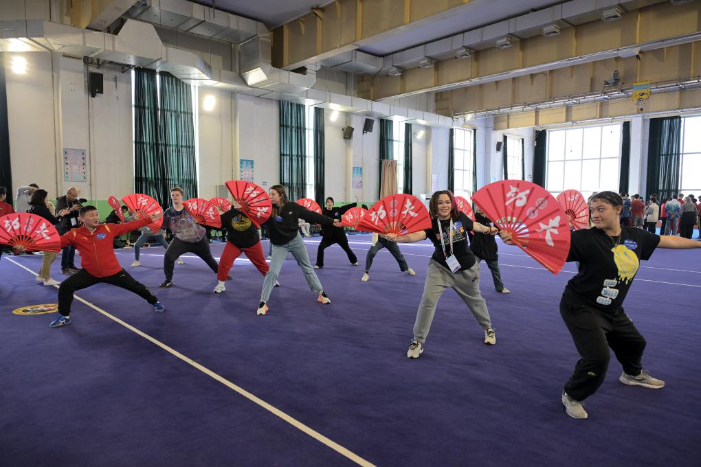 2024年3月19日,首都体育学院,美国华盛顿州中学生代表团的成员体验功夫扇。新华社记者 李鑫 摄