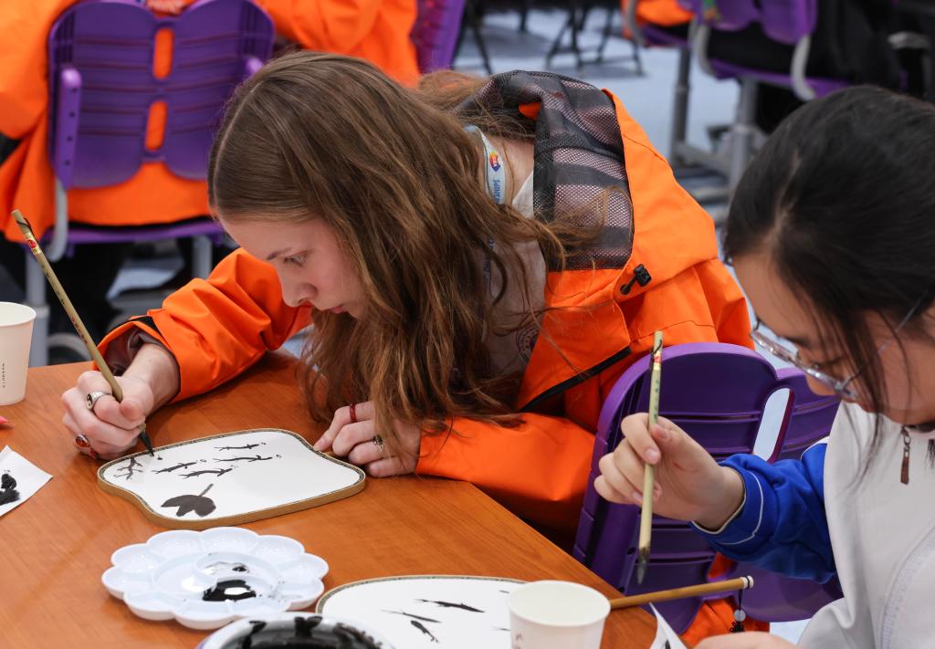 2024年3月18日,清华大学附属中学,美国华盛顿州中学生代表团的成员与中国中学生一起体验水墨画扇面绘制。新华社记者 殷刚 摄