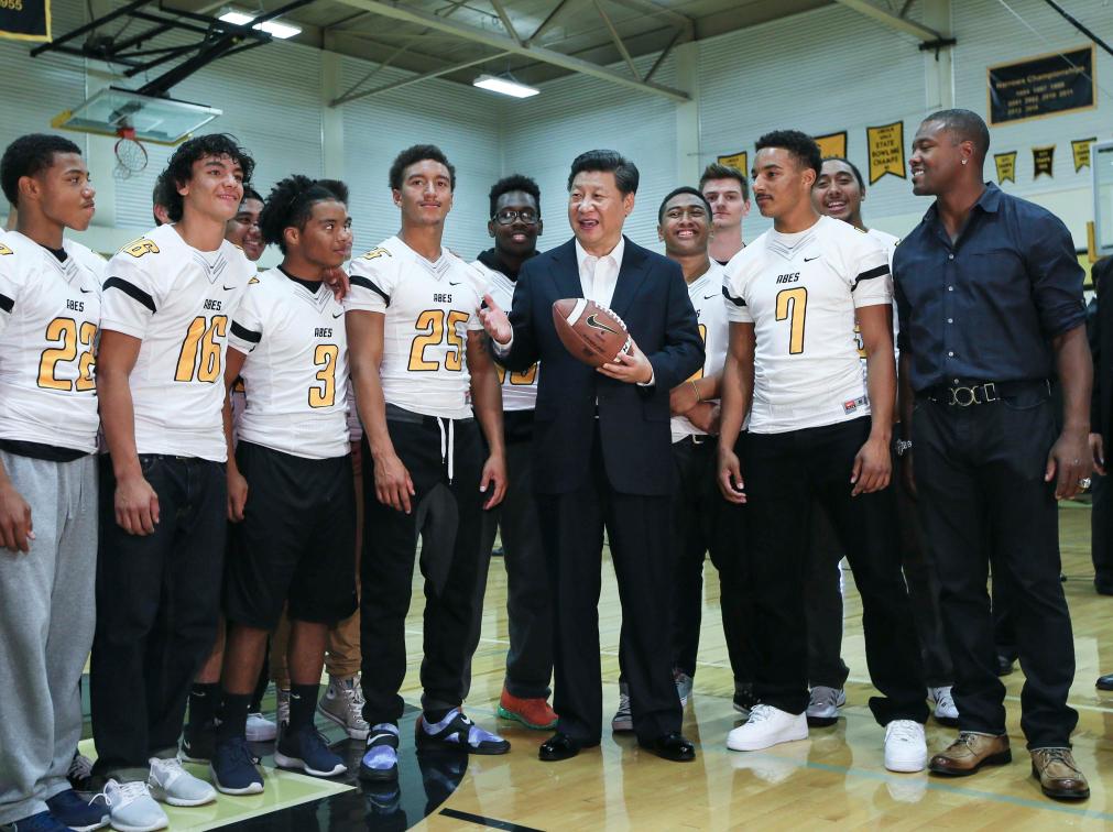 2015年9月23日,国家主席习近平参观美国塔科马市林肯中学。这是习近平在学校体育馆,同上橄榄球训练课的学生们亲切交谈。新华社记者 兰红光 摄