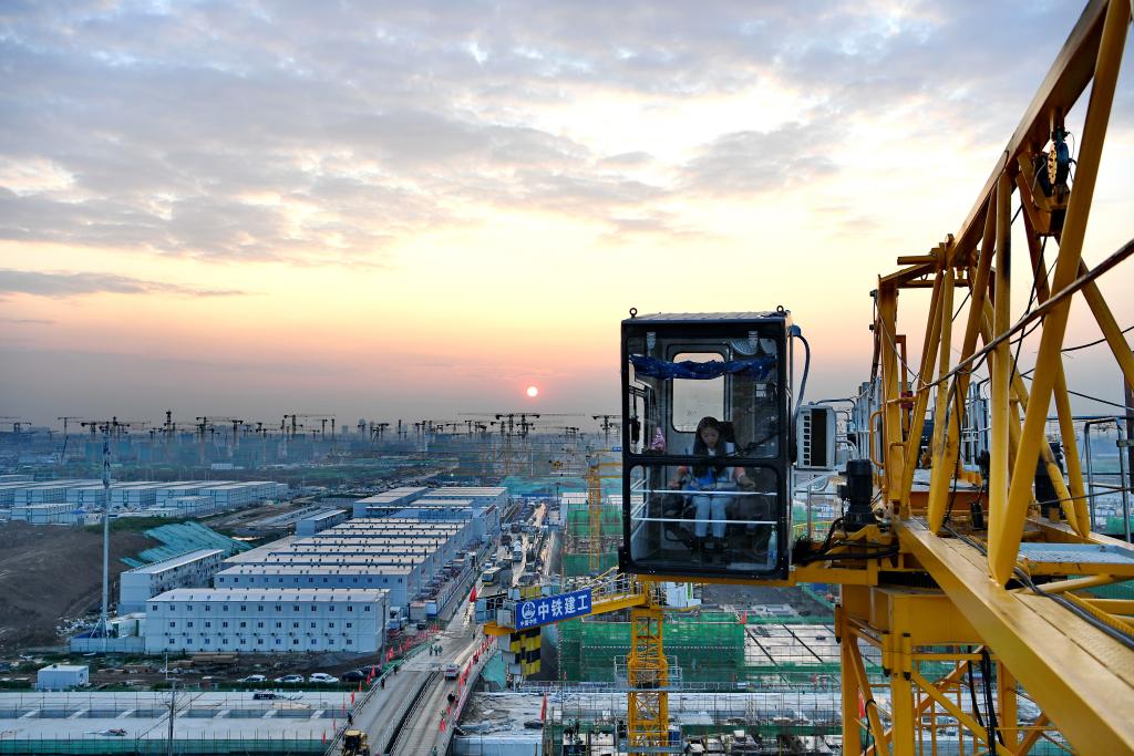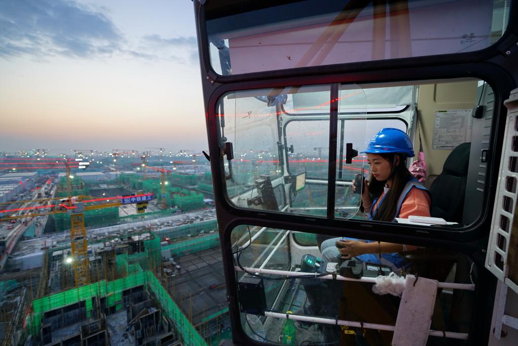 为了更好地突出这对“塔吊夫妻”的工作场景,有一些恐高的我站在塔吊臂上一个不足1平方米的变辐小车内,由阿洛春梅操作将我推至塔吊臂顶端。夕阳西下,落日、塔吊、建筑与工作间内的阿洛春梅搭配在一起,雄安新区“拔节生长”之貌与建设者不舍昼夜的奋斗之姿充分彰显。