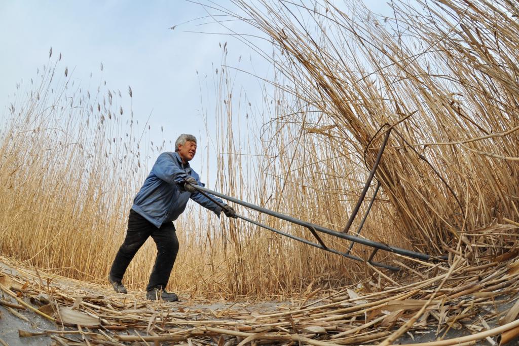 村民在白洋淀内收割芦苇(2018年1月17日摄)。