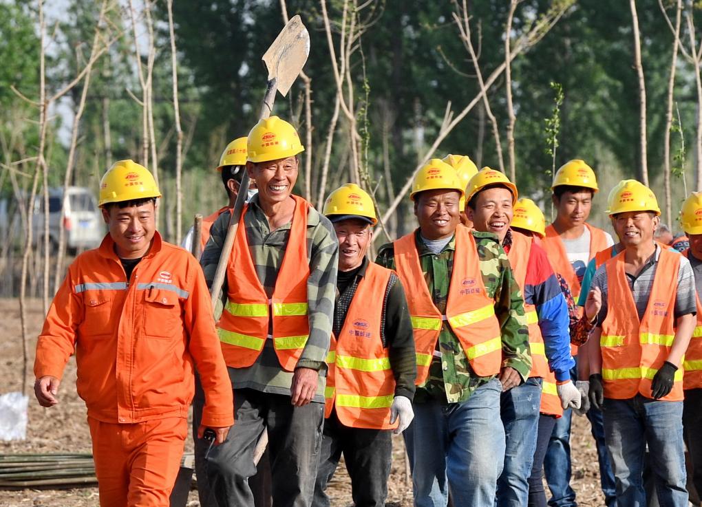 这是在雄安新区“千年秀林”施工现场拍摄的植树工人(2018年4月27日摄)。