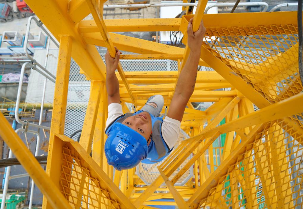 雄安新区容东片区安置房项目建设工地的塔吊司机吉那小虎在攀爬塔吊(2020年9月24日摄)。